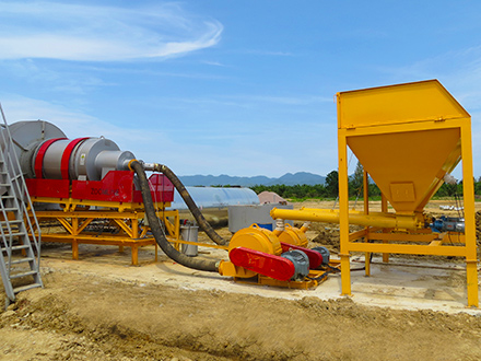自動化程度高,方便控制骨料溫度,通過干式攪拌筒卸料。